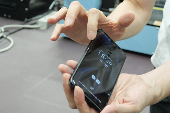 角曲げ試験は、スマートフォンの四隅のうち、1カ所にのみ負荷をかけるものだ。