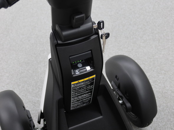 駆動用モーターは定格出力250Wが2個となる。後二輪直接駆動方式で、実用登坂角度は10度だ。一般的なショッピングモールの立体駐車場の坂道が約10度だという。車両サイズは全長1130×全幅645×全高985mm、最外側での最小回転半径は1430mmだ。乗車できるのは、身長140〜185cm、体重が荷物も含めて100kg以下に限られる。生活防水仕様だが、スリップの危険があるため雨の日の運転は控えるよう求めている(当然、雪道も運転できない)。傘を差しながら運転することもNGだ。