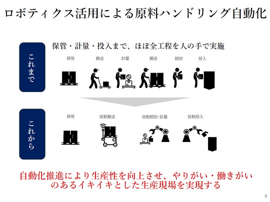 サントリーホールディングス グローバル技術戦略推進部 部長の澤崎純一氏は「これまで原料のハンドリングにおいて、保管から輸送、計量、乾燥、開封、投入とほぼ全工程を人手によって実施してきた。われわれは非常に多様な原料を用いており、その多様な原料がさまざまな梱包形態になっている。そういった幅広い梱包形態に対応してロボットでハンドリングすることは技術的に非常に難しく、自動化の壁になっていた。また、既存工場での自動化はスペースの制約も大きな問題になっていた。ただこれからは、全ての工程をロボットや自動搬送機などの活用によって自動化を目指している」と語る。