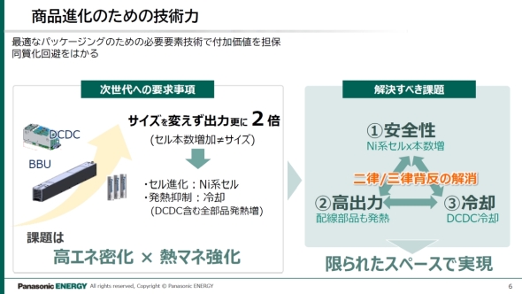 BBU自体の進化も継続しなければならない。データセンターではサーバラックなどのサイズが規格化されていることもあり、例えばBBUの出力を増やす場合でもサイズを大きくすることはできない。加藤氏は「次世代品ではサイズを変えずに出力を2倍にすることが求められている。この場合、内蔵するDC-DCコンバーターを含めて発熱が大きくなるので高エネルギー密度化と熱マネジメント強化の両方を解決しなければならない。これらの二律背反する課題の解決は極めて困難だ」と述べる。