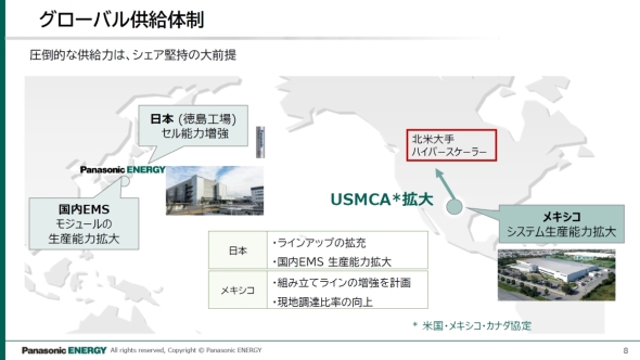 ESS事業が顧客に対するイニシアチブを取り続ける上で重視しているのが「圧倒的な供給力」(加藤氏)である。現在、電池セルは徳島工場(徳島県松茂町)で、電池モジュールやBBUなどのシステム製品は国内EMSで生産している。ただし、国内で生産方法を含めて開発を完了したシステム製品は、パナソニック エナジー メキシコで大規模生産に移行することで「圧倒的な供給力」を実現している。