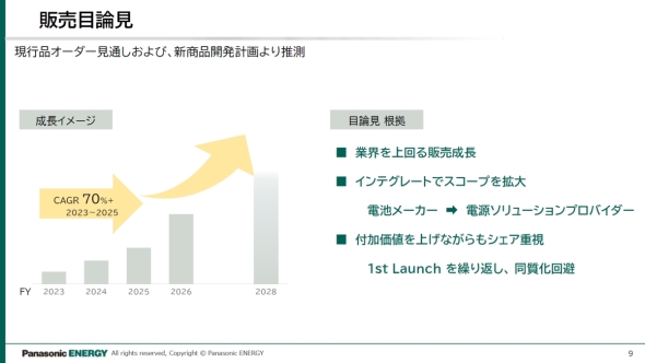 ESS事業の売上高は2023〜2025年度の3年間で年平均成長率70%以上で伸びている。2026年度以降は、ポジションニングを電池メーカーから電源ソリューションプロバイダーに移行することでさらに大きく売上高を伸ばす見込みである。利益面でも、パナソニック エナジー全体の営業利益率13.8%を上回るなどけん引する役割にある。