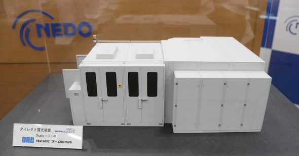 オーク製作所とNEDO(新エネルギー・産業技術総合開発機構)は2025年8月27日、東京都内で記者会見を開き、オーク製作所がNEDOの委託事業の一環として開発したダイレクト露光装置の概要を説明した。1μmの解像性能を持った光学系を新たに開発するなどし、有機材料上で線幅2μmの銅めっき配線形成が実現可能だと確認したという。