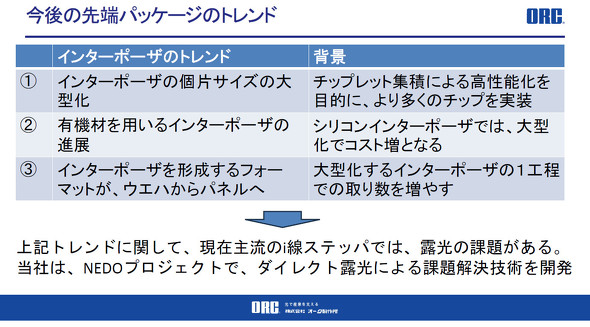 オーク製作所がNEDOの委託事業を受けて、新たなダイレクト露光装置を開発した。今後のインタポーザのトレンドに対応した、装置となっており既に多数の企業から引き合いが来ているという。