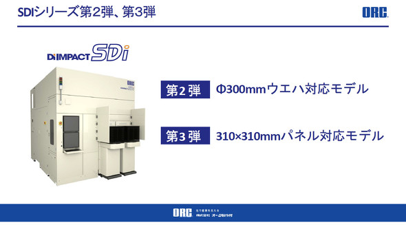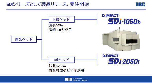 オーク製作所ではダイレクト露光装置「SDiシリーズ」として展開する。既に510×515mmのパネル量産向けに、露光ヘッドがh線(波長405nm)で微細RDL形成用の「SDi-1050h」と、i線(波長375nm)で絶縁材微小ビア形成用の「SDi-2050i」の受注を開始しており、2025年度中の出荷を目指している。「半導体メーカーや基板メーカー、液晶パネルメーカー、材料メーカーなど約30社から引き合いが来ている。初号機の納入先は台湾もしくは韓国になる見込みだ」(中澤氏)。2026年度には、径300mmのウエハーや310×310mmパネルの対応モデルもリリースする予定だ。