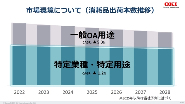 コロナ禍を経て複合機やプリンタを用いた紙への印刷需要は右肩下がりの傾向にある。OKIのLEDプリンタ事業でも消耗品出荷本数が毎年低下している状況だ。同社 執行役員 兼 コンポーネントプロダクツ事業部長の井上崇氏は「ただしその内訳を見ると一般OA用途に比べて、医療、流通/小売り、公共、調剤、製造/物流といった紙を必要としている特定業種や特定用途の需要は大幅な落ち込みにはなっていない。これらの業種にとってプリンタはコミュニケーション手段としてなくてはならない存在であり、まだ多くの潜在ニーズがある。だからこそ新製品を投入する意義がある」と語る。