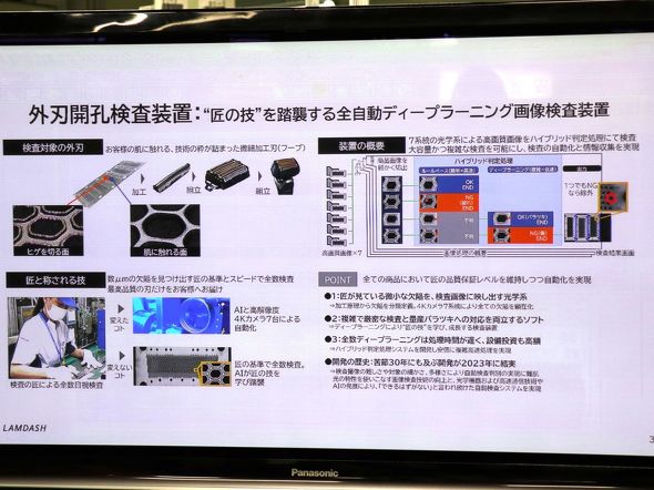 彦根工場のシェーバー生産では樹脂成形に必要な金型/工具を内製し、外刃/内刃製造や刃の品質検査、シェーバーの組み立てなど、モノづくりの上流から下流までを一気通貫で行っている。そんな中でパナソニックは、モノづくり変革の一部として「伝統と未来の融合を図るAI(人工知能)活用と自動化」に取り組んでいる。従来の技術ではできなかった工場内の自動化を最新のソリューションと組み合わせることで可能にし、生産性や品質を大きく向上させている。