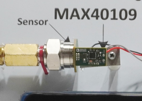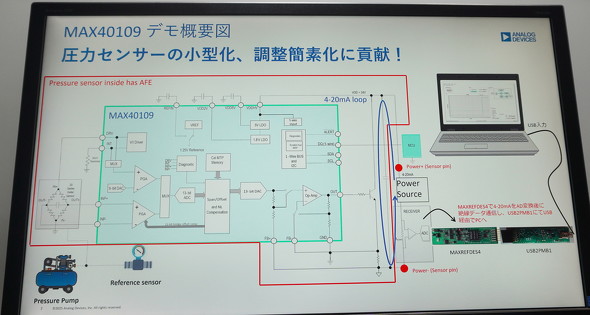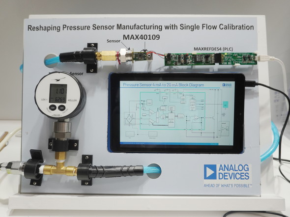 会場では、外付けの圧力センサーとMAX40109の圧力測定値を比較するデモンストレーションが披露された。MAX40109が測定したブリッジセンサーのデータは計装機器で広く用いられている4-20mA信号で出力される。この4-20mA信号を高精度産業用AFE「MAXREFDES4」を介してA-D変換した後で、絶縁データ通信によりインタフェースボード「USB2PMB1」経由でPCのUSBインタフェースに出力した圧力センサーのデジタルデータがディスプレイに表示される。アナログ・デバイセズの説明員は「外付けの圧力センサーが1.1barを示したときに、MAX40109でPCにデジタル出力された計測値は1.13barを表示し、誤差は0.05bar以内に収まっている」と語った。