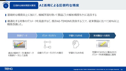 XTIMONでは、基礎的な解析精度の向上に加え、機械学習を活用して特定の製品群ごとに最適化を図った。既存のAI技術を活用した反り解析精度向上/効率化システム「AI-TIMON」をXTIMON向けに改良し、従来比で30%以上の精度改善を達成している。