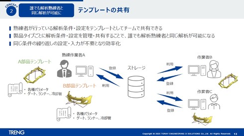 熟練者が設定した解析条件をテンプレート化し、チーム内で共有できる「テンプレートシステム」を導入した。解析者ごとのパラメーター調整や試行錯誤を減らし、効率的で再現性の高い解析を実現する。経験の浅いユーザーでも熟練技術者と同等の結果を得られ、技術伝承の効率化にも寄与する。