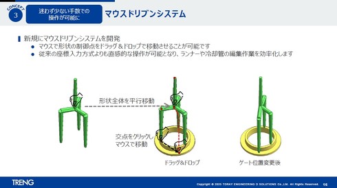モデル上でランナーなどの形状の制御点をドラッグ&ドロップで編集できる「マウスドリブンシステム」を新たに搭載した。テンプレート登録した形状を呼び出し、マウス操作のみで微調整してモデルを完成できるなど、直感的な操作性を実現した。