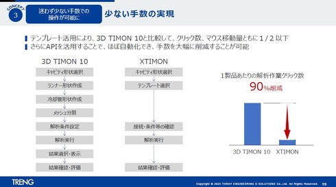 「XTIMONのテンプレート機能を活用した場合、3D TIMON 10と比べてクリック数とマウス移動量がいずれも半分以下に削減される。1製品当たりの解析作業におけるクリック数は最大90%削減可能であり、APIによる自動化を組み合わせれば、手作業をほぼゼロにすることもできる」(山川氏)
