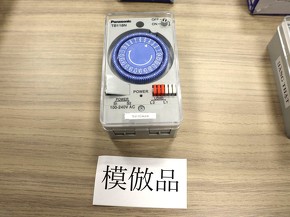 上のタイムスイッチについては、会場内で一番悪質な模倣品だと感じた事例である。外箱のデザインも同じで、中身の製品についても一見すると模倣品と正規品の区別がつかない。正規品は正面に印字してある文字の濃さが統一されており、横側は本体にきちんと印字がしてある。