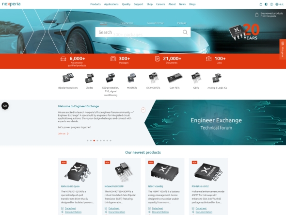 この蘭半導体メーカーとは、オランダの汎用ロジック/ディスクリート半導体メーカーであるネクスペリア(Nexperia)のことだ。車載半導体大手であるオランダのNXP(NXP Semiconductors)の汎用ロジック/ディスクリート事業がスピンアウトする形で2016年に独立したネクスペリアは、NXPと同様に車載分野の売り上げ比率が高い。Webサイトのトップページでも、1万6000以上ある製品のうち車載グレード対応の製品が6000以上あることを強調している。