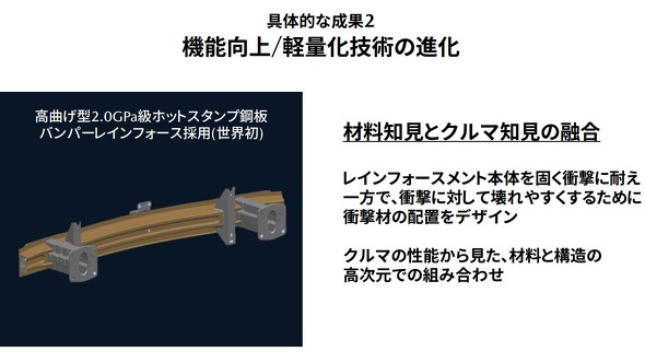 2つ目は、フロントのバンパーレインフォースメントに日本製鉄の「高曲げ型2.0GPa 級ホットスタンプ用鋼板」を採用したことだ。この部位は軽量化のためにアルミ材が使われる傾向が強かったが、アルミは材料コストが鉄の3倍以上になるという課題があった。