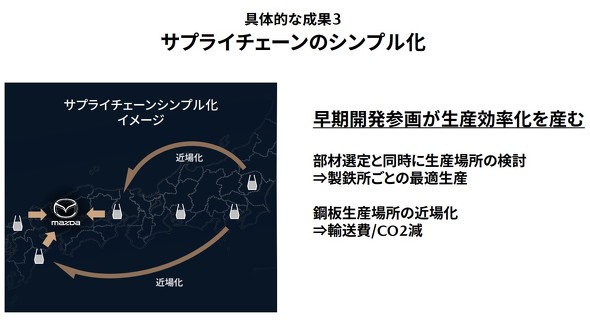 開発の早い段階から日本製鉄が参画することで、鋼板選定の時点から生産/物流の最適化までを考慮できるようになった。具体的には、「どの製鉄所で鋼板を生産するのが最適か」「どうすればマツダの車両組立工場に近い場所で生産できるか」といった点を、開発初期から検討できるようになる。