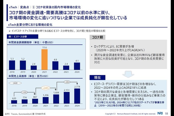 コロナ禍では対面販売が制限されていた影響もあり、Eコマース分野でインドのスタートアップ企業が大きな成長を見せた。その後は需要が落ち着いてコロナ禍以前の水準に戻り、顧客獲得/維持の仕組みづくりといった事業力が不足している企業は成長が鈍化している。2023年には1万5921社、2024年には1万2717社のスタートアップ企業が事業を停止したという。