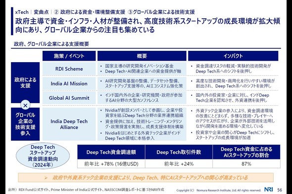現在は、政府主導で資金やインフラ、人材が整備されており、Deep Techをはじめとした高度技術系のスタートアップ企業が成長する環境が構築されつつある。ここにグローバル企業からの資金/技術支援が進んでおり、高度技術系のスタートアップ企業の今後の成長力に期待が集まっているという。佐々木氏は「巨大な内需を有するインドでは、特定市場に依存しない事業設計をしていた企業が淘汰の波に飲まれずに、持続的な成長を可能にしたと思っている」と述べている。