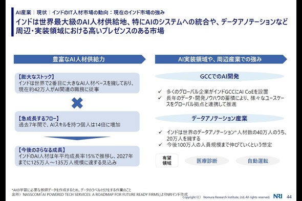 生成AI(人工知能)の進化が受託開発型のビジネス脅威になるという声がある中で、IT産業で成長を続けているインド政府/産業の動向に注目が集まっている。NRIインド シニアコンサルタントの渡邊大氏は、「現在のインドはIT人材だけではなく、AI人材においても世界最大級の供給拠点になっている。AI/DXの実装を支える開発拠点としても機能し、AIのモデルトレーニングに必要なデータをラベル付けするデータアノテーション領域でも注目が集まっている」と語る。