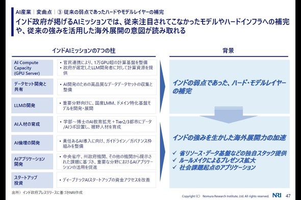 インド政府は「インドAIミッション」という7つの戦略方針を立案し、インドの従来の強みでもあるアプリケーション開発や人材の数を生かして海外展開力を高めている。