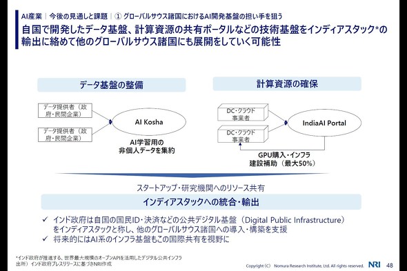 インド国内では、スタートアップ企業や研究機関がAI学習に活用できるデータ基盤や計算資源を1つに集約する技術基盤を開発している。これらの基盤をインドの公共デジタル基盤である「インディアスタック」へ統合し、インド国外にも展開する方針だ。
