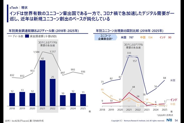 NRIインド コンサルタントの佐々木雄大氏は「コロナ禍における資金調達額は、コロナ禍前後と比較して約3〜4倍の金額になっている。2021年には44のユニコーン企業が生まれているが、直近ではその数は1桁に落ち着いた」と分析する。