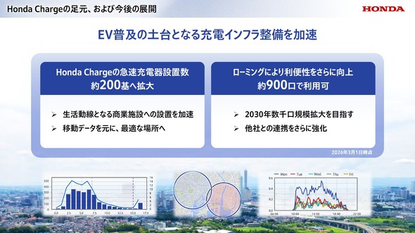 ホンダは2025年9月から開始した充電ネットワークサービスである「Honda Charge(ホンダチャージ)」の拡充を進め、ニトリグループなどと協業して2030年に向けてEV充電器を数千口へ拡大していく。