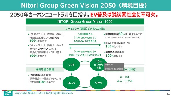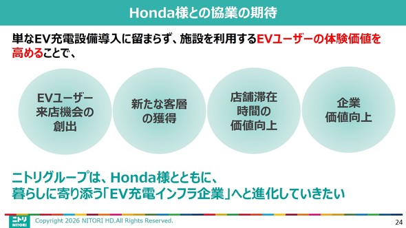 ホンダとの協業を進めることで、EV充電設備を導入するだけではなく、施設を利用するEVユーザーの体験価値を高めることができるとニトリグループは捉えている。これにより、EVユーザーの来店機会の創出や新たな客層の獲得、店舗の滞在時間/企業価値の向上を図っていく。奥田氏は「ニトリグループはこれまでは人々の家の中の暮らしを支えてきたが、これからはEV充電インフラの構築を通じてスマートシティーを実現し、家の中と外の暮らしという部分も支援していく」と述べている。