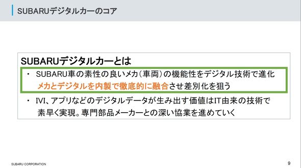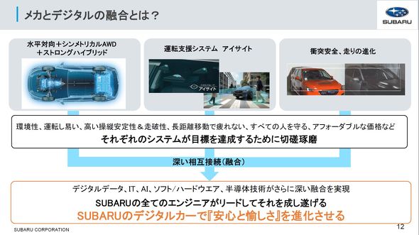 スバルは「安心と愉しさ」の提供を企業方針として掲げている。車両(メカ)とデジタル技術を内製で融合させて、車両の機能性を引き上げる独自のアプローチで「SUBARUデジタルカー」の開発に取り組んでいるという。