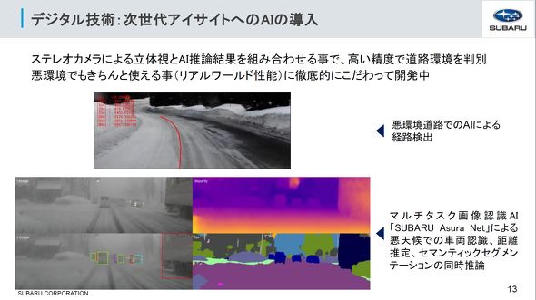 今回の協業によって、次世代アイサイトおよび車両制御の中核要素として、AURIX TC4xを制御統合ECUに搭載していく。パワフルで堅牢(けんろう)な同製品を用いて、車両に搭載されるアイサイトのステレオカメラとAI(人工知能)を融合させ、雪道などの悪天候下でも高い安全性を発揮する高度な車両制御の実現を目指す。
